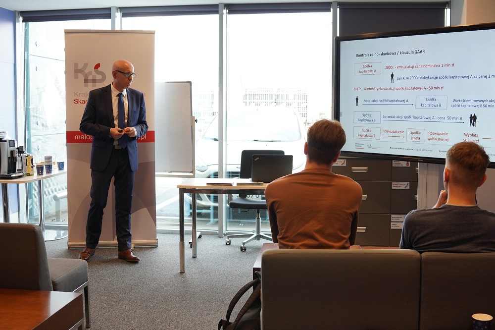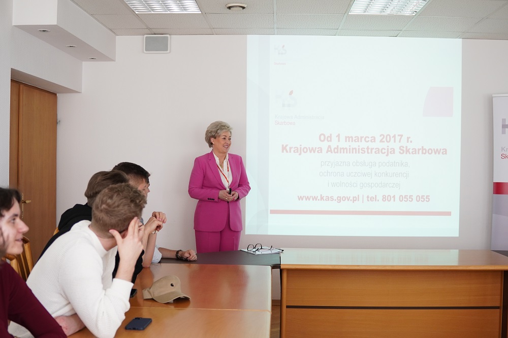 30 maja spotkaliśmy się ze studentami w budynku przy ul. Wadowickiej 10. Emil Chojnacki, zastępca dyrektora Izby Administracji Skarbowej ds. orzecznictwa, opowiadał o zadaniach, jakie wypełnia organ. Poruszył tematykę związaną z postępowaniami podatkowymi oraz postępowaniami przed sądami administracyjnymi. Na koniec, w ramach studium przypadku, studenci wcielili się w rolę dyrektora Izby Administracji Skarbowej w Krakowie i rozpatrywali odwołanie od decyzji organu podatkowego. Bożena Drabik, dyrektor Izby Administracji Skarbowej w Krakowie podziękowała studentom za udział w spotkaniach i zaprosiła do pracy i służby w KAS.
