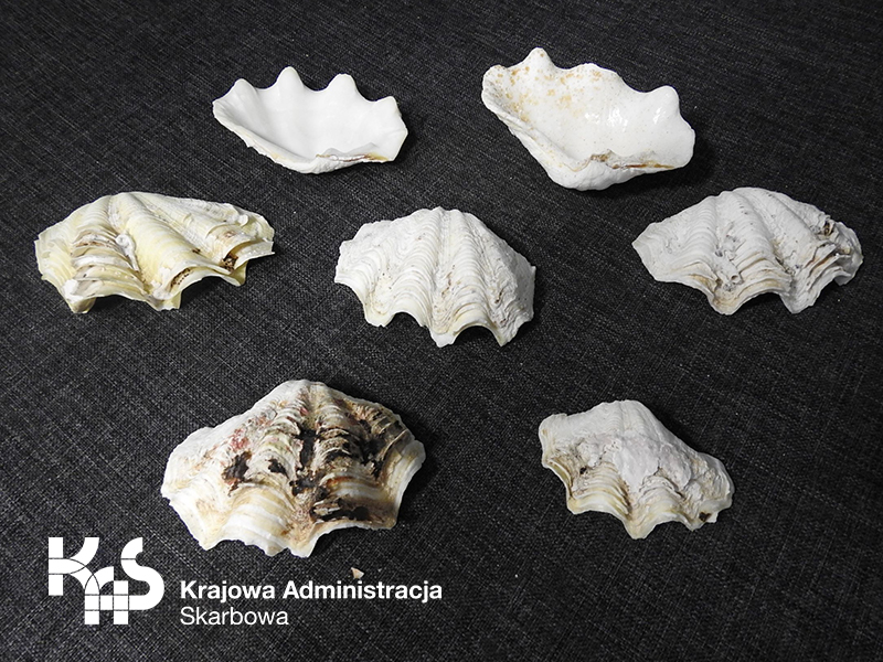 Po przeprowadzeniu kontroli celno-skarbowej, okazało się, że podróżna, obywatelka Polski przewozi w bagażu aż 56 sztuk muszli przydaczni. Wg jej wyjaśnień, ujawnione okazy, które ważyły ponad 2 kg, zostały zebrane w morzu i na plaży w Malediwach, skąd przyleciała z rodziną.